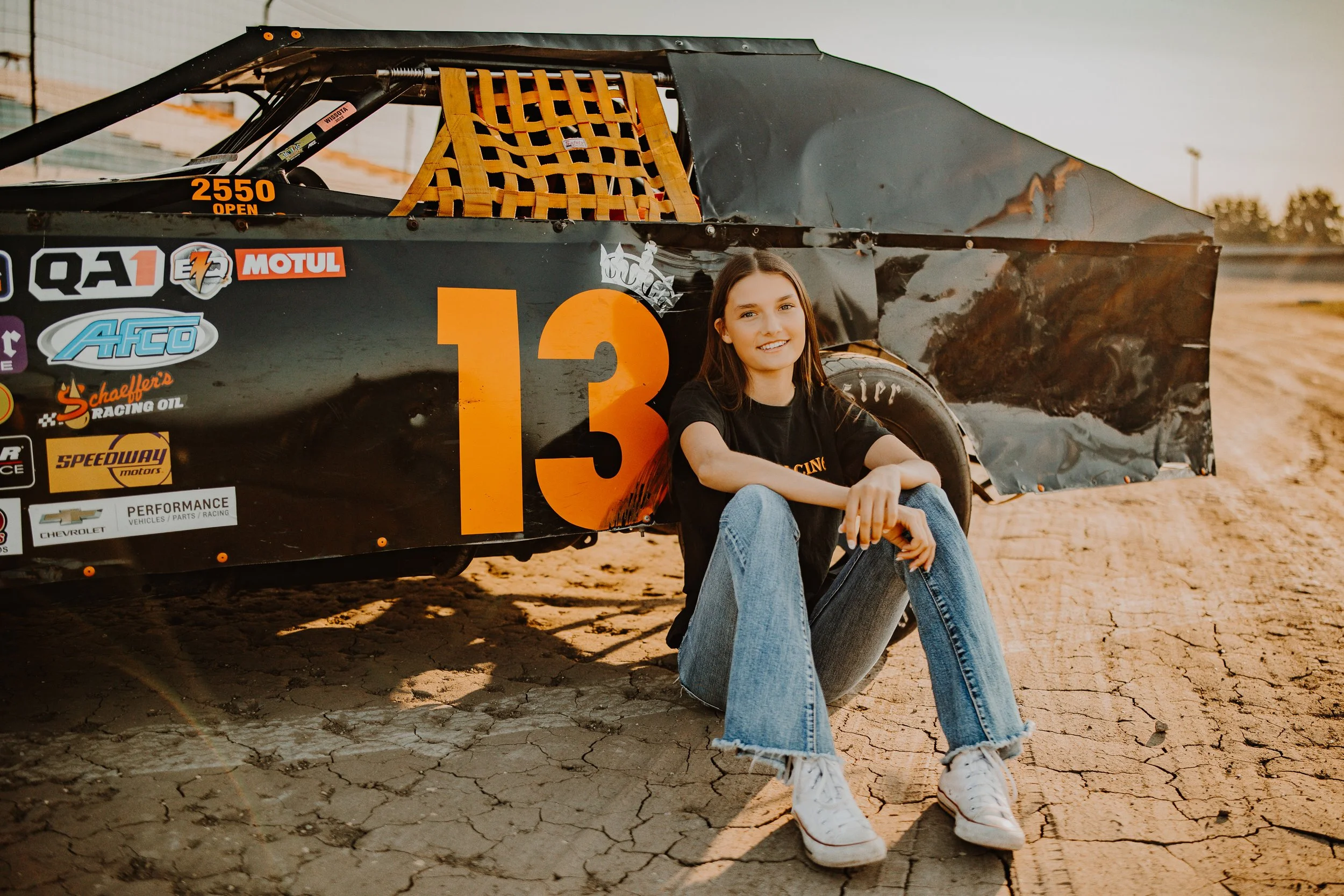 We ended Kylie’s session at the raceway to take some photos with her dads car. This offered a new challenge for me as I have never done senior pictures with a racecar. It was super fun though playing around with how to pose with the car and trying new ways to be creative!